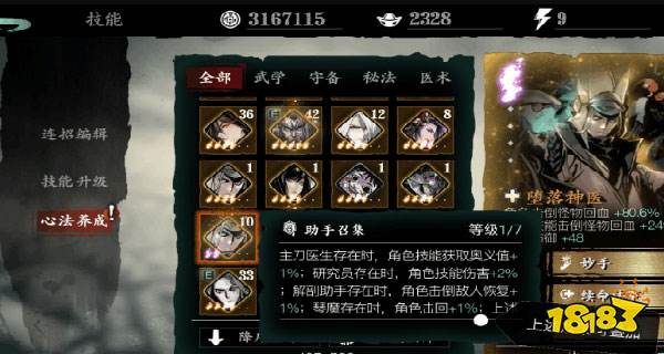 助手召集:当主刀医生出来的时候,角色技能加1%的奥义值。当研究员出来的时候,角色技能伤害加2%。当解剖助手出来的时候,角色击倒敌人恢复1%的生命值。当琴魔出来的时候,角色击回1%。
