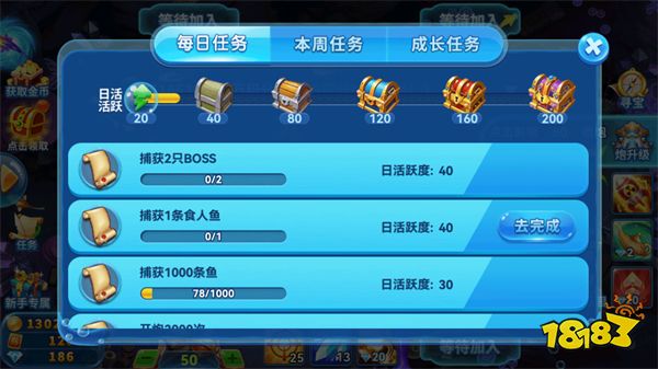 1、玩家进入游戏后可以通过完成任务来获取大量奖励,有每日、本周、成长三种任务可以完成。