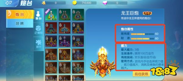 2、在炮台的选择上,看清楚每个炮台的属性和威力,射速、最大威力和使用方式也会影响到捕鱼的概率,当然是数值越大越好。