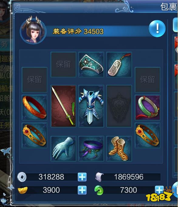 图7:包裹界面-界面左侧可以查看当前装备以及财富状况