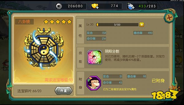 八卦镜为二娃专属法宝,可以提升自身属性外还有特殊技能增加自身能量和降低敌方能量