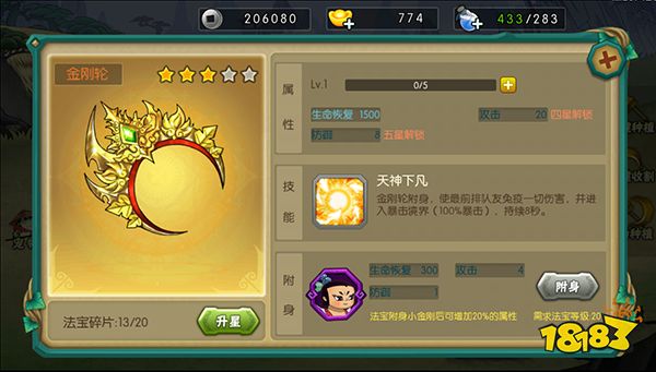 金刚轮为小金刚专属法宝,可以提神自身属性外还有特殊技能友方前排免疫伤害且增加暴击