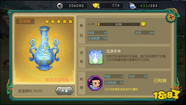 玉净瓶为五娃专属法宝,可以提神自身属性外还有特殊技能提升团队能量和回复血量