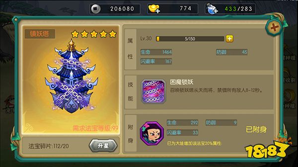 镇妖塔为大娃专属法宝,可以提升自身属性外还有特殊技能禁锢所有敌人