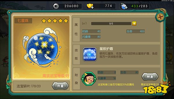 七星珠为三娃专属法宝,可以提神自身属性外还有特殊技能免疫敌方一次技能伤害