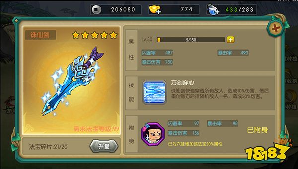 诛仙剑为六娃专属法宝,可以提神自身属性外还有特殊技能对所有敌人早晨伤害