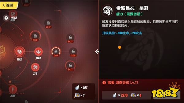右侧一栏中的“星落”可以让卡萝尔进入拳套解放状态,且期间不会消耗解放状态时间,建议11级时就点出。(下图为解放状态的讲解)