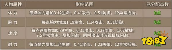 速度、耐力、腕力、体力等四个方面,每提升一点都可以获得对应的属性加成,但是各属性加成是不同的。比如玩家分配一点体力,可增加3.12生命值、0.41攻击力、0.51防御力、12异常抵抗属性。如果玩家分配到耐力上,可增加生命、攻击、防御、异常抵抗上。具体的加成属性如下,玩家可以作为加点参考: