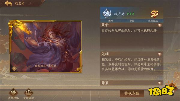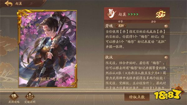 点评:“七 阴”之一,百变女王。赵襄是唯一推荐的祈福(万符)武将,其武将强度和游戏体验感绝对是顶级的:4血3技能,每局游戏技能搭配都不一样:【父魂】+【强识】的永动组合,【奔袭】+X也能瞬间上天;即使是不起眼的【无言】+【再起】也能让赵襄成为不死之身,强烈推荐新手将赵襄做为自己的第一个豪将!