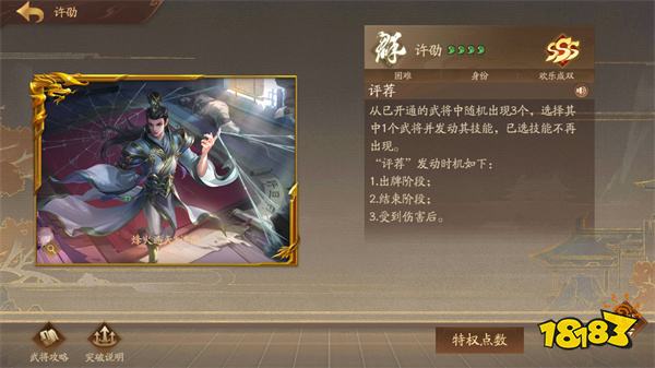 点评:“七 阴”之一。武将强度与玩家自身拥有的武将数量相关,每个回合许劭都可以使用不同的武将技能,左慈和许劭相比就是烛光与太阳。许劭也是唯一一个可以在回合外反制一下留赞的武将,硬要说缺点的话就是每回合需要花相当的时间选技能,影响其他玩家体验。