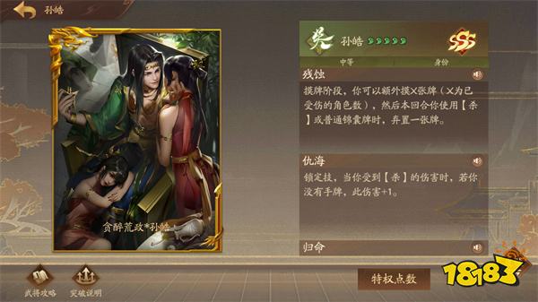 点评:身份局中的“最强常备主公”,其他身份也不弱。前期发动【残蚀】一口气摸10来张牌,体验感爆棚!单挑时至多摸4张牌强度有所下降,但是孙皓本身5血,已经超越绝大多数武将了。