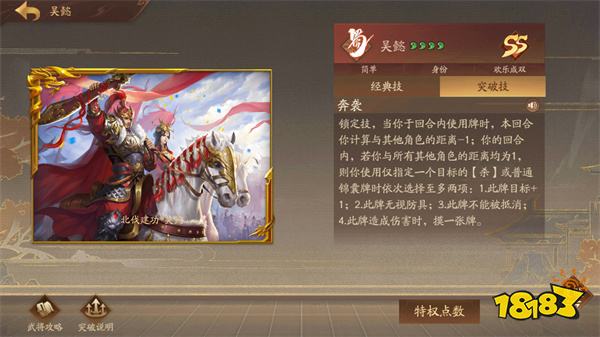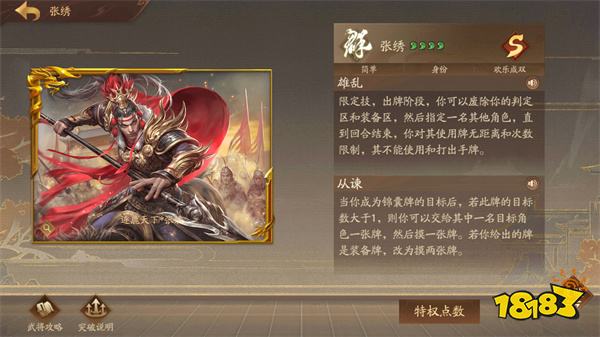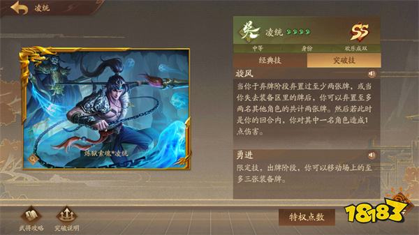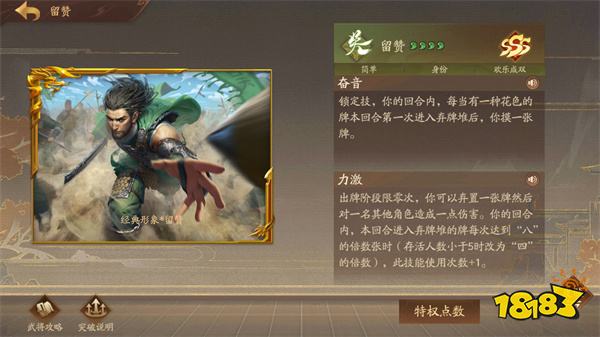 点评:【胆守】进可攻,退可守。朱然发挥最好的模式是军八,欢乐成双和PVE中也不弱。使用时记住一点就行:其他角色的回合【胆守】摸了牌就不能打伤害了。