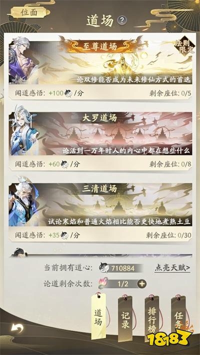 每日参与【论道】获得道心,消耗对应道心值即可点亮天赋。在越高的道场悟道,能获取更多道心值。