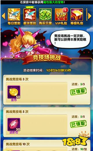 所谓的挑战福利就是完成所给的任务,来获得金币,3天一个轮回,分别通过竞技场,副本,探索来完成任务,3天下来,全部完成,可以获得400金币(净赚,由于竞技场需要购买次数,必买。