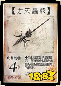 距离4。当你使用的【杀】是你的最后一张手牌时,你可以为这【杀】指定至多三名目标角色,然后按照行动顺序结算它。吕布和许褚拿着画戟剔牙的时候真的是令人肝颤,当然这把武器发动的条件比较困难,还是皇叔用起来比较顺手,甘宁大乔偶也可以,大乔可以一刀杀三人后可以拿这张方块Q武器乐人。