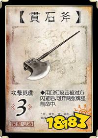 许褚神器,憋牌几轮就是为了这把武器的强制命中,当然同样可以作为【诸葛连弩】攻击的前奏,手牌多的武将用起来很不错,尤其对方觉得自己有闪有八卦正美的鼻涕冒泡的时候,不要想了,把自己多余要弃掉的手牌扔掉,变废为宝,化作一记重击,连着鼻涕泡把鼻血一起打出来。孙尚香使用贯石斧时,可以弃掉自己的马摸牌。