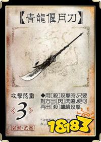 距离3。当你使用的【杀】被【闪】抵消时,你可以立即对相同的目标再使用一张【杀】,直到【杀】生效或你不愿意出了为止。注意追击的时候杀的效果是第一张,也就是打藤甲的时候第一张是火杀就可以,打仁王盾第一张是红的就可以,后面的无所谓。一个长距离版的诸葛连弩,缺点是最多只能造成1点伤害,不过一般被青龙瞄上了通常选择不闪留着以后有人动手时闪,所以你手牌多却只有一张杀的时候可以用青龙来吓唬人让他不敢出闪。