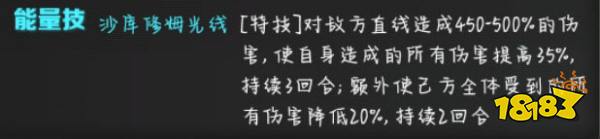 对故方直线造成450-500%的伤害,使自身造成的所有伤害提高35%,持续3回合;额外使己方全体受到的所有伤害降低20%,持续2回合,免伤,增强伤害提高,3回合可以叠加