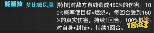 2、能量技:直线高伤,附加高额燃烧伤害,自身会被封技1回合