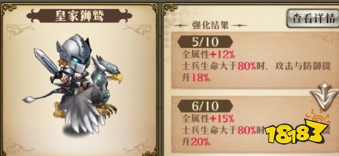 能带的就只有皇家狮鹫这么一个,没有利昂元帅的蝙蝠,也没有雪莉的天使。狮鹫的攻击虽为飞兵中最高的,但80%生命的条件限制比上面几个兵种主动攻击就增加攻击力严格不少,而且练它的人也不多。