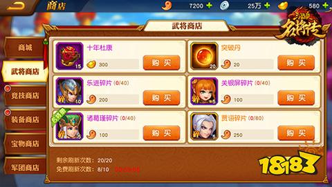 武将商店可以购买各阵营紫色以上品质武将碎片和完整武将卡片。