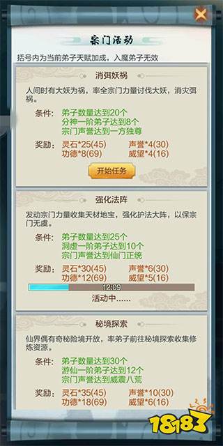 (2)仙界的宗门活动也是给威望的,和门派任务类似。只不过这个除了跟自身等级有关外,和弟子的境界和属性有关。提高威望的获取速度就要多招募加威望的弟子,尽快提升前几个弟子的境界。