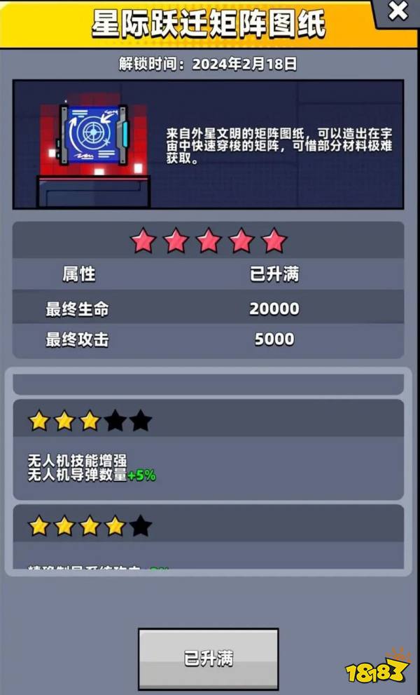 ②星际跃迁矩阵图纸(满星):精确制导系统攻击+20%、无人机导弹数量+20%、单发伤害+10%、暴击率+10%。