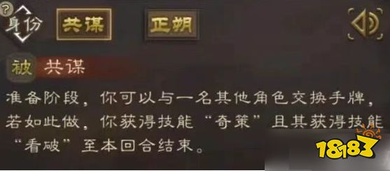 准备阶段可与任意角色互换手牌(无视兵乐),随后自身获得“奇策”、对方获得“看破”。能抢关键牌(如无懈),换牌后打一波爆发再印锦囊,收益可观,被换方心态易崩。克星如神曹操也成提款机。