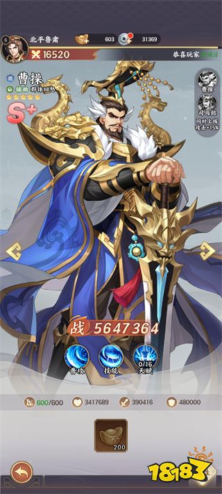 技能对敌方前排3人造成83%法术伤害,并降低其25%最终免伤(持续2回合),是破前排、抬输出的核心引擎。配合曹操“乱世”效果,可快速叠满减防阈值,打出成吨真实伤害。