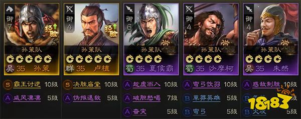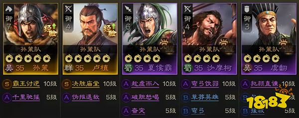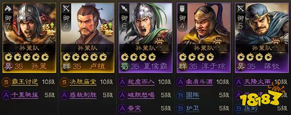 接下来就是填空题,孙策作为统率3.64成长并且自带战法【霸王讨逆】,拥有控制作用,优先适合极限控制流。当然,其他两个流派也适用,搭配上预抽卡池中好用的紫将,三种阵容如下所示。