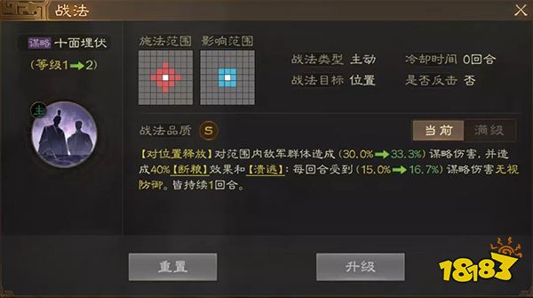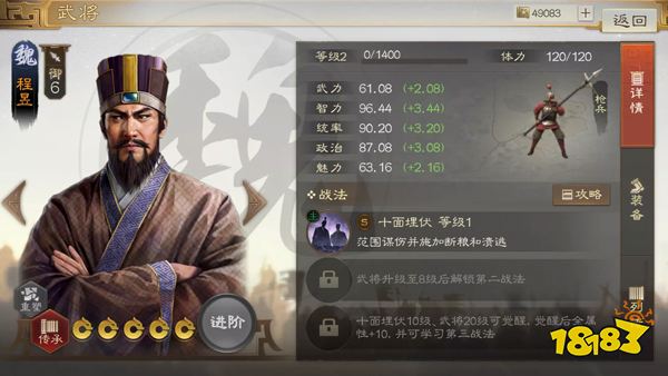 程昱智力成长3.44,自带战法【十面埋伏】单纯的谋略伤害并不高,但附带【断粮】和【溃逃】效果非常可观,持续伤害充分。很显然,他不适合高爆发阵容,他适合作为输出补充,并且他的身板也不脆,站位不用特别靠后。依然适合战法牧阵容,属于挂DEBUFF的定位。