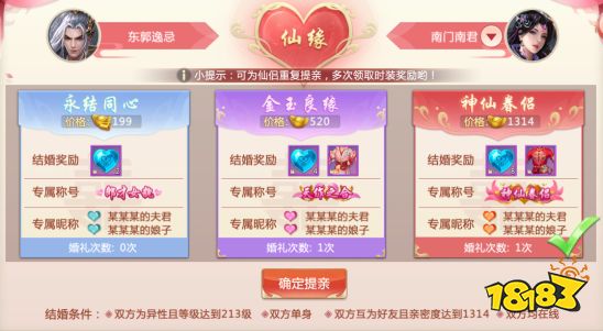 等级达到213级的单身男女,可通过 主界面—仙缘—前往结婚 ,传送到红娘处,选择喜结良缘,向心仪的对象提亲。提亲时男女双方必须在线,同时亲密度也要达到1314。提亲前可以先通过赠送鲜花来提高双方的亲密度哦~