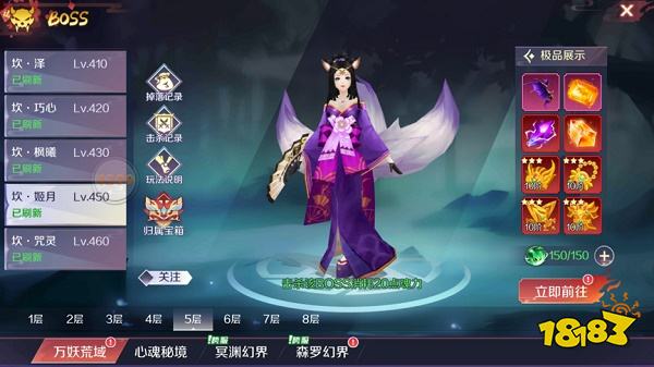装备这块的话主要是通过打BOSS获得的,BOSS地图包括了四个,万妖荒域、心魂秘境、冥渊幻界和森罗幻界。森罗幻界需要260级开放,大概要到第2~3天才能打到。