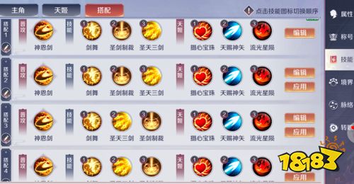 搭配一:1技能选择剑舞,2技能选择天圣三剑,3技能选择圣剑制裁,这套选择适用于打BOSS的时候,伤害比较高,而且出手速度快,在圣剑制裁的加成下,可以省点时间打出更多的普攻。