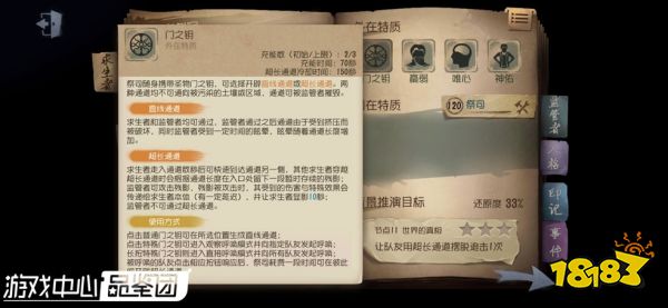 祭司随身携带门之钥,可以开辟直线通道和超长通道,求生者和监管者都可以穿过直线通道,监管者不可以通过超长通道,但求生者通过超长通道会留下残影,监管者可以攻击残影造成伤害。