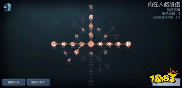 第三种天赋搭配为:【底牌】+【张狂】+【破坏欲】。这种搭配适合黄衣之主、鹿头和疯眼。黄衣和鹿头的技能非常强大,守尸能力也很强,但前期追人能力较弱,因此可以携带“闪现”(黄衣可以携带“巡视者”),配合【破坏欲】快速捕捉第一个求生者。凭借强大的守尸能力,可以开启二阶技能,后期使用传送进行开门战或守电机。疯眼在守电机和守尸方面都是一流的,不需要封窗和一刀斩,因此【张狂】+【底牌】是最佳选择。