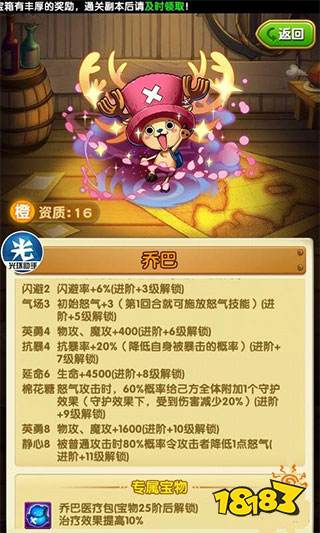 接下来是我们的乔巴,哎。这个想水,我都不想水了!主要是生气,问啥不给加强(当个辅助,还是可以的一般+4就可以用,有能力还是建议进阶9,百分之60几率给全体套盾,那时候才能体现他的价值)