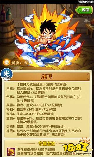 路飞作为一个队长,可以说是合格的,能坦又能输出。放前排那是妥妥的!但缺点也有:碎片来源太难!导致于进阶是个问题,但这往往对于有耐心的船长来说,这都不是事。时间可以决定一切,卡牌游戏就是要你慢慢的培养,慢慢的玩。不可能让你一步登天,也不现实对不对!所以还是踏踏实实的慢慢攒资源培养吧!(土豪无视)路飞橙后进阶7宝物25就可以华丽的放前排了,如果能进阶加11(怒气攻击回复伤害百分之60的血量),吼吼。这货都自带奶妈(还好草帽就一个奶,不然你路飞让奶情何以堪),让你不用为他发愁!路飞,他可是号称永动机的男人啊!7阶成型,9阶爆炸,11成神。