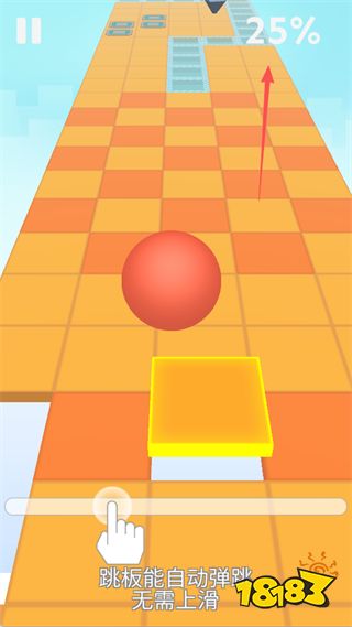 关卡机制是游戏中的另一个关键要素。在游戏过程中,赛道上会设置一些特殊机关,例如跳板。当红球踩到跳板时,会自动弹跳,无需玩家进行额外的上滑操作。每个关卡的进度会实时显示,当进度达到100%时,玩家即可完成挑战。