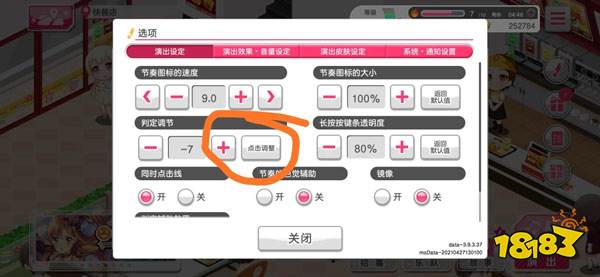在演出设定中,看待判定调节旁边有个点击调整的按钮,点击进去就可以开始调整了。除此之外,这里还能调节节奏图标的速度、节奏图标的大小以及长按按键条透明度等。