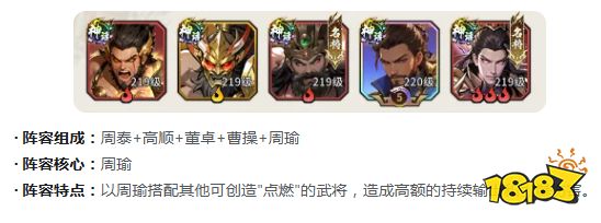 火神降世队必须要安排,主要的核心就是周瑜。另外里面还有周泰,董卓以及高顺。一方面可以抵抗伤害,同时也可以配合周瑜去创造点燃的效果,在层层灼烧叠满之后就可以触发引爆。