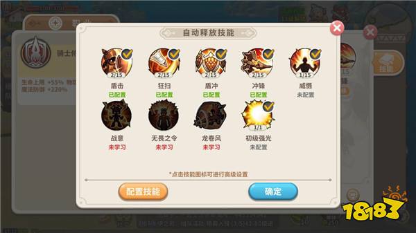 除了进行技能升级外,在选项窗口的左下方,还可以进行“配置技能”和“自动战斗”的调整。