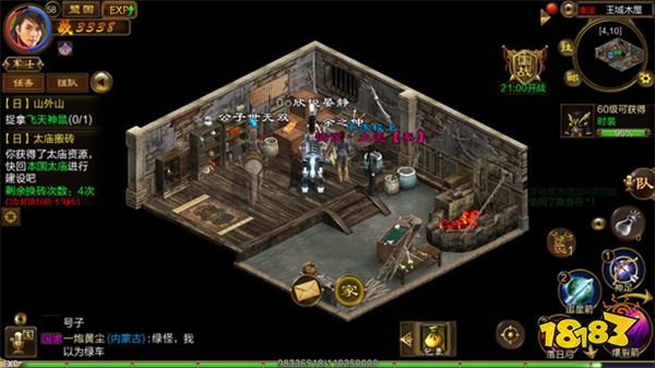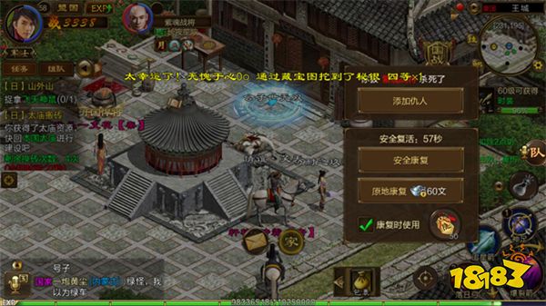 火力太猛扛不住了怎么办?那就避其锋芒吧!你一定会发现太庙的东北方有一个传送点,没错,那就是传说中的小木屋,你点进去就会传送到小木屋,就会进入安全地带,等待换砖冷却时间,这种办法是最安全而且减少原地银两的方法!