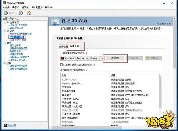 在桌面右键打开NVIDIA控制面板,选择“3D设置”的“管理3D设置”,在右边选择程序设置,点击“添加”。