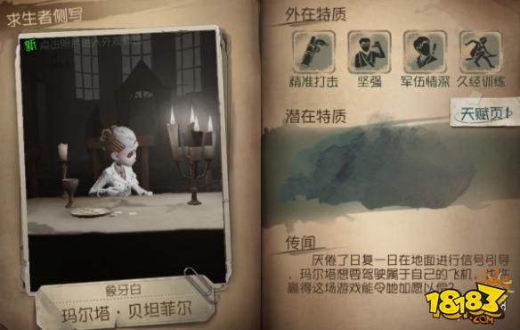 空军的核心技能是精准打击,用信号枪击中屠夫能增加眩晕时间,在逃跑和救人都很实用,而坚强和久经训练提高空军在椅子上的苟活能力和板窗交互速度,让空军变得十分的全面。唯一的debuff是队友被绑椅子上时解码速度会大幅降低,所以在队友被抓时哟多去支援救助。