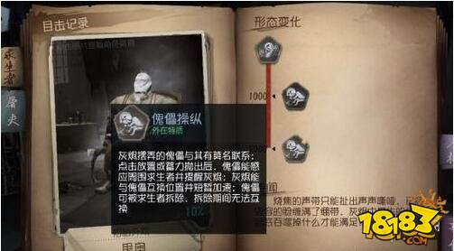 灰烬摆弄的傀儡与其有莫名联系,点击放置或者蓄力抛出后,傀儡能感应周围求生者并提醒灰烬,灰烬能与傀儡互换位置并且短暂加速,傀儡可以被求生者拆除,拆除期间无法互换。(感觉很强的技能啊,探视野+瞬间移动,可怕)
