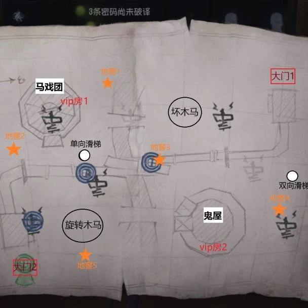 以律师地图为参照物。月亮河地图中有5个地窖刷新点,2个逃生大门,2个VIP房。具体分布位置如下图所示。