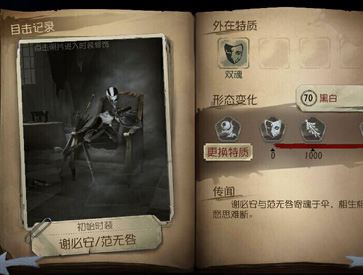 天赋说明:左边的张狂可以快速解锁黑白无常的一阶段技能,方便了捉人这一块儿,下面的挽留必点,一刀斩是后期翻盘的利器,耳鸣能更快的找到并发现求生者,崩坏可以干扰求生者的节奏【推荐指数:★★★★】