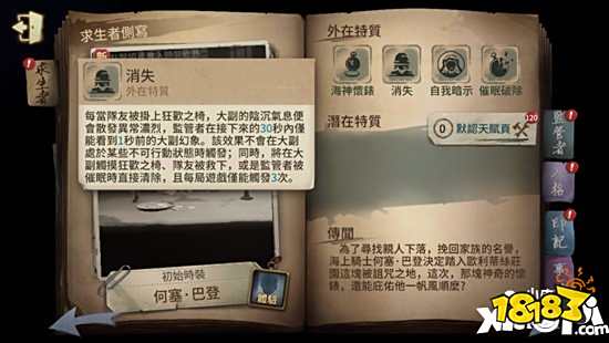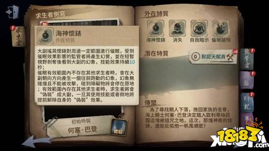 大副摇晃怀表对周边一定范围进行催眠,受到催眠效果影响的监管者将产生幻觉,并在短暂视野剥夺后看到大副的幻象,技能效果持续10秒。