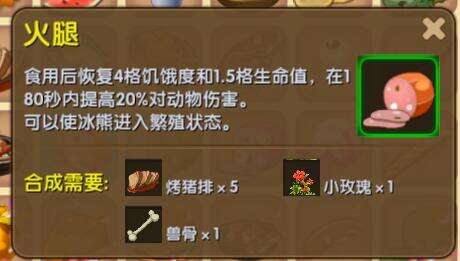 合成需要:烤猪排X5、小玫瑰X1、兽骨X1